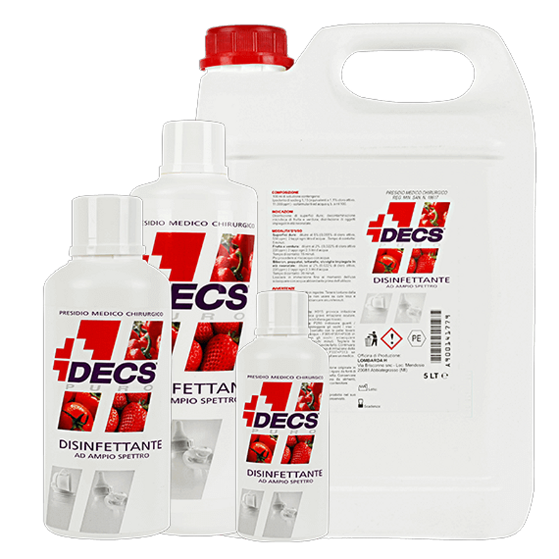 Decs Puro è una soluzione disinfettante a base di cloro attivo elettrolitico 1,1%. Indicato per la disinfezione di superfici dure; poppatoi, tettarelle, giochini, stoviglie ed oggetti impiegati in età neonatale; decontaminazione microbica di frutta e verdura.