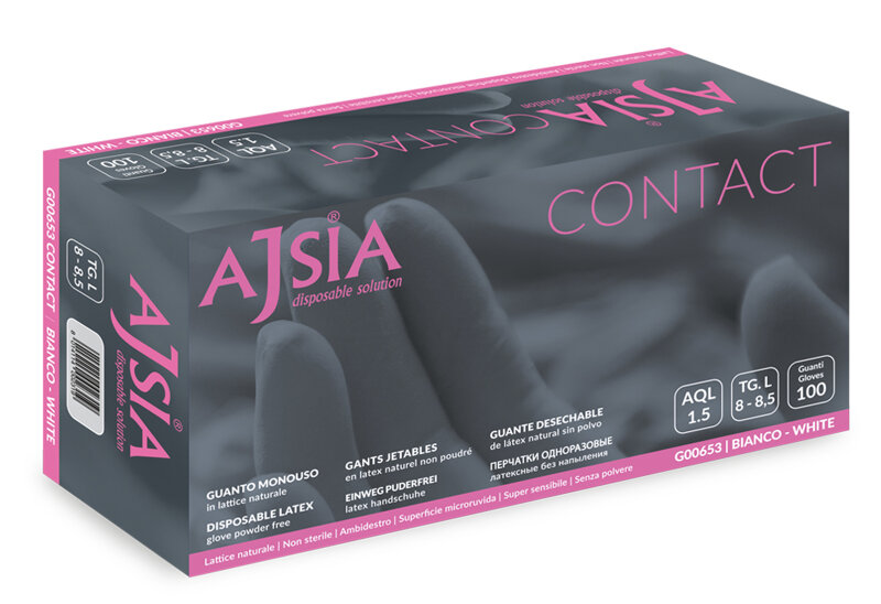 Il guanto monouso da esaminazione Ajsia G00653 CONTACT è realizzato in lattice naturale, clorinato senza polvere.
